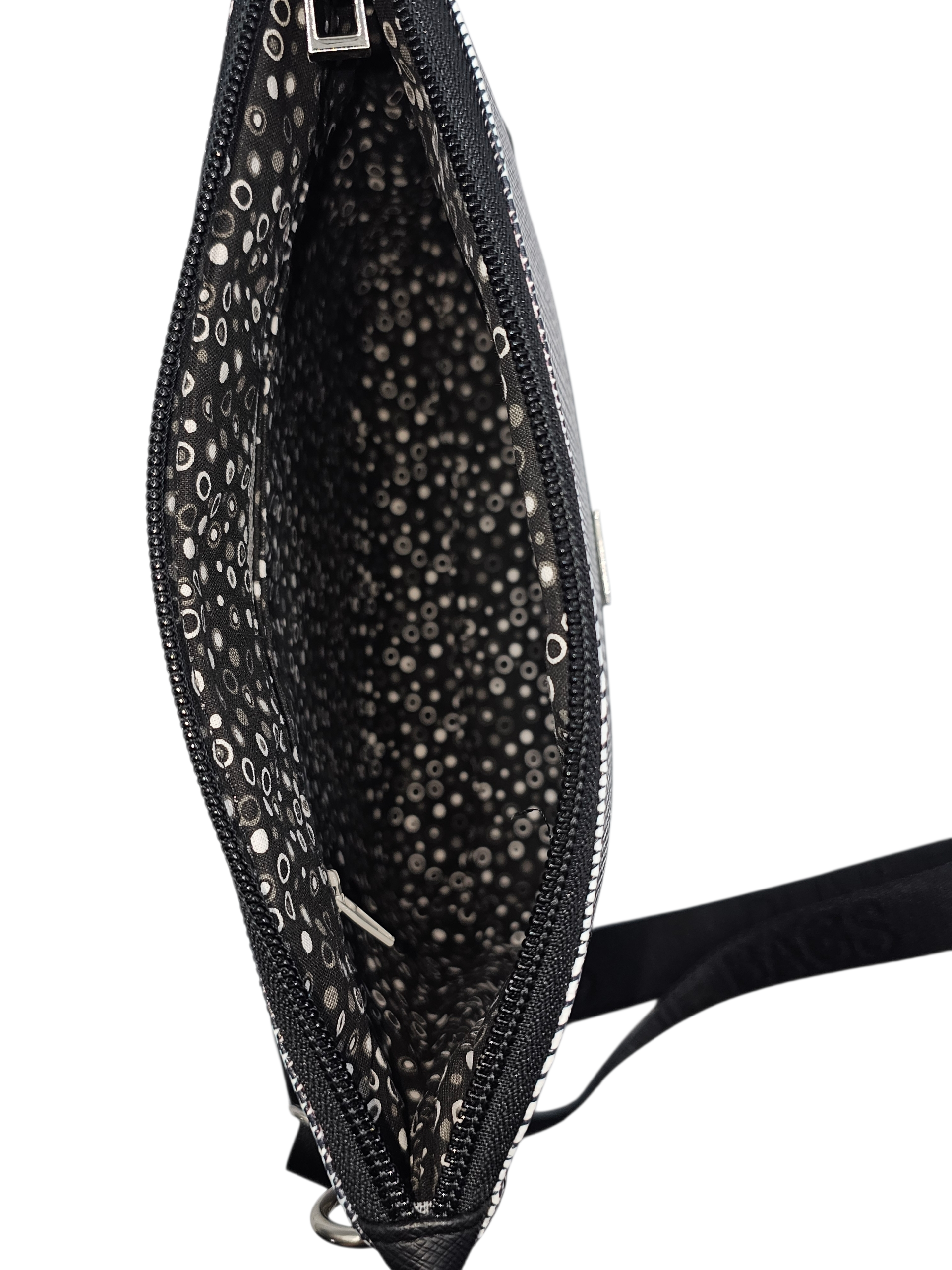 Made with Faux Leather and Silver Hardware. This crossbody features a slip pocket as well as a zipper pocket.