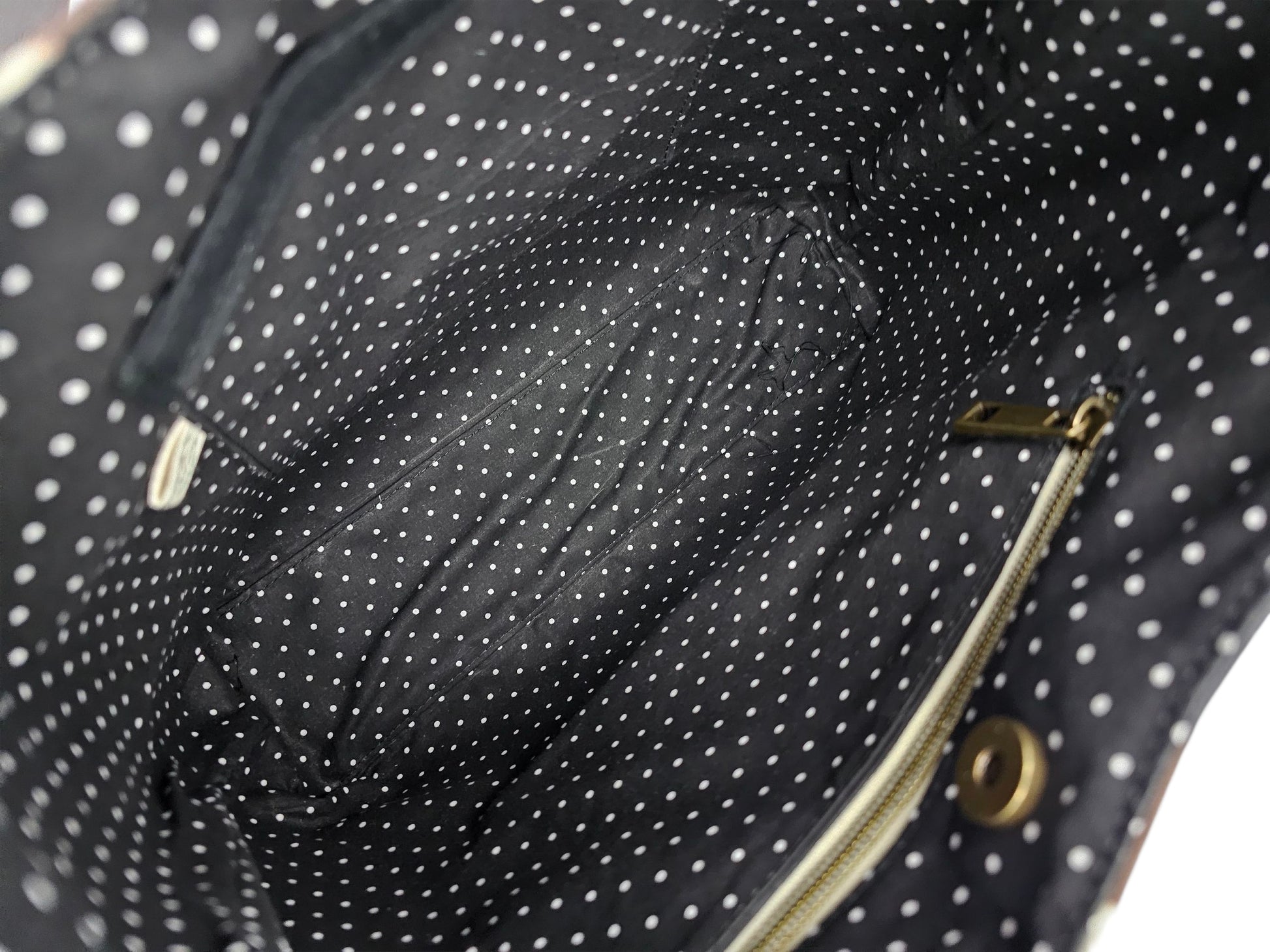 Made from Faux leather, with a quilt cotton lining and brass hardware.