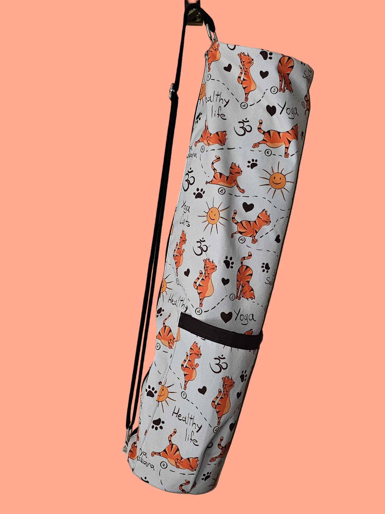This is not your typical yoga mat bag. Made from waterproof outdoor fabric on the outside and lined with waterproof canvas on the inside these bags are made for strength and durability. Designed to fit a standard yoga mat of 3mm up to 6mm. Leaving room for your extras. An extra external double pocket is added, for your keys, phone, protein bars. This Bag finished off with an a 1 1/2" wide adjustable strap, to fit over your shoulder comfortable.